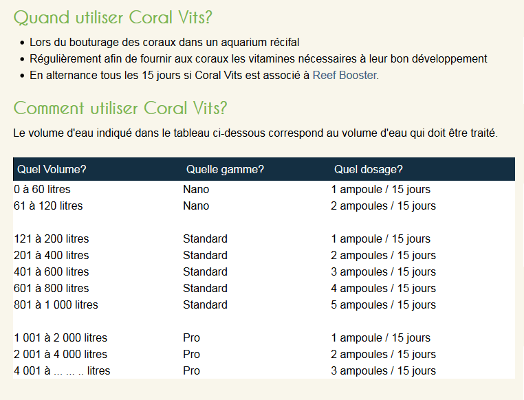 Les coraux, comme les poissons et les invertébrés, ont besoin de vitamines pour vivre, or ils ne peuvent les synthétiser en quantité suffisante et doivent donc en trouver dans leur nourriture. Coral Vits répond à ce problème et fournit toutes les vitamines nécessaires au développement des coraux et au bien être des poissons.