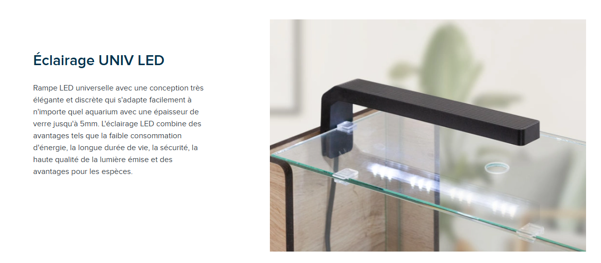 Aqua Lounge est le parfait mélange de charme classique et de design moderne, un bac unique en verre soutenu par une base en bois rétro disponible en trois couleurs sobres, apportant une touche chaleureuse à votre espace. Cette nouvelle gamme d'aquariums comprend trois modèles équipés d'un éclairage UNIV LED et du filtre écologique BIO FILTER.