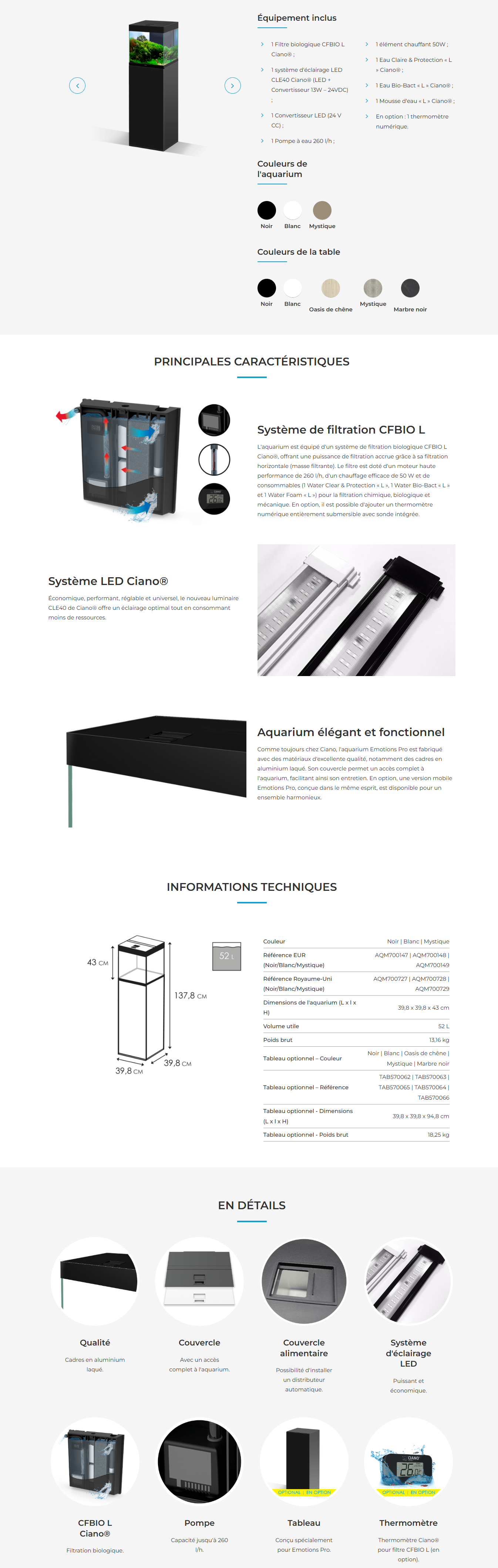 L'aquarium Emotions Pro est fabriqué avec des matériaux d'excellente qualité, notamment des cadres en aluminium laqué. Son couvercle permet un accès complet à l'aquarium, facilitant ainsi son entretien. En option, une version mobile Emotions Pro, conçue dans le même esprit, est disponible pour un ensemble harmonieux.