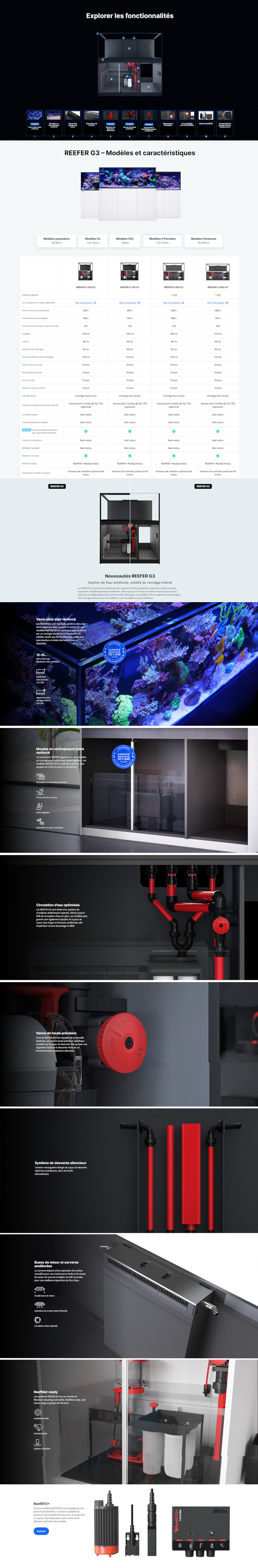 Les systèmes REEFER G3 sont dotés d’une gestion de l’eau à l’hydrodynamique améliorée, de meubles et de cuves extra-renforcés, de décantations REEF-SPEC hautes performances, d’un osmolateur intelligent intégré et d’une garantie extensible à 5 ans. Ils constituent la plateforme idéale pour profiter pleinement de l’Expérience Red Sea, en combinant nos équipements intelligents au sein d’un écosystème synchronisé et contrôlé via l’appli ReefBeat.