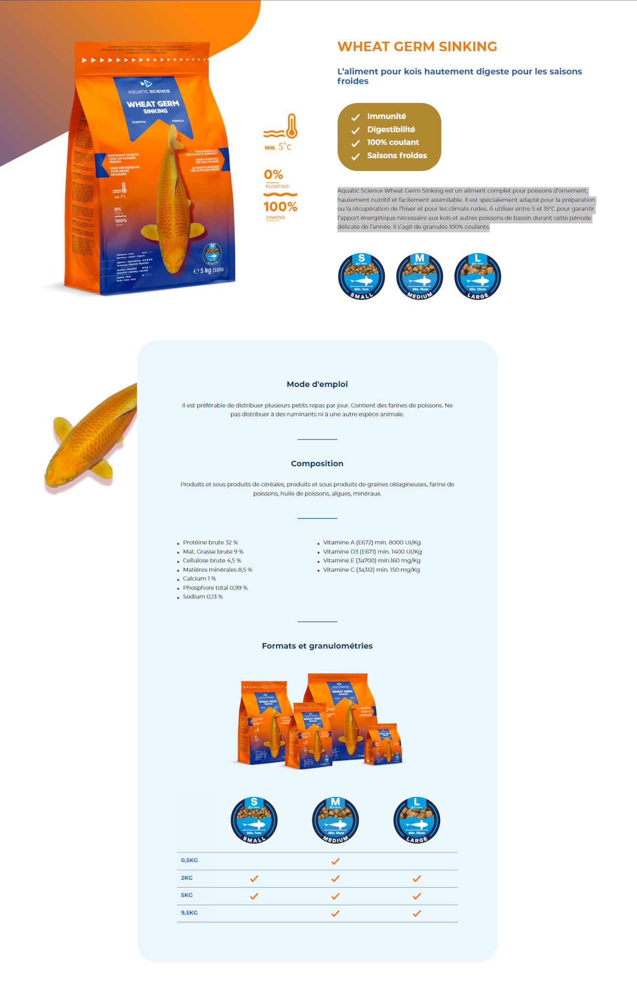 Aquatic Science Wheat Germ Sinking est un aliment complet pour poissons d’ornement, hautement nutritif et facilement assimilable. Il est spécialement adapté pour la préparation ou la récupération de l’hiver et pour les climats rudes. A utiliser entre 5 et 15°C pour garantir l’apport énergétique nécessaire aux koïs et autres poissons de bassin durant cette période délicate de l’année. Il s’agit de granulés 100% coulants.