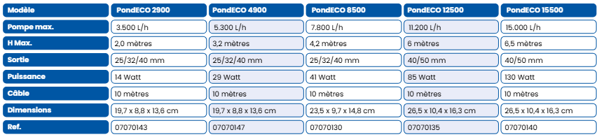 Pond Eco, pompe de bassin électronique économique et compacte avec des raccords polyvalents. Peut être utilisée en fonctionnement à sec et immergé, grâce à sa protection thermique contre le fonctionnement à sec et la surcharge. Très faible consommation d'énergie et capacité maximale de la pompe, parfaite pour les filtres des petits et moyens bassins. Connexion multifonctionnelle. Remplacez la crépine par le raccord de tuyau fourni et vous pouvez alors connecter la pompe à un filtre ou un skimmer, ou l'utiliser dans une installation sèche. Capacité de la pompe 3500 L/h, consommation 14W, hauteur de remontée max. 2m, sortie 25/32/40mm, câble de 10 mètres, approbation TUV et garantie de 2 ans, dimensions L x L x H 19,7 x 8,8 x 13,6 cm.